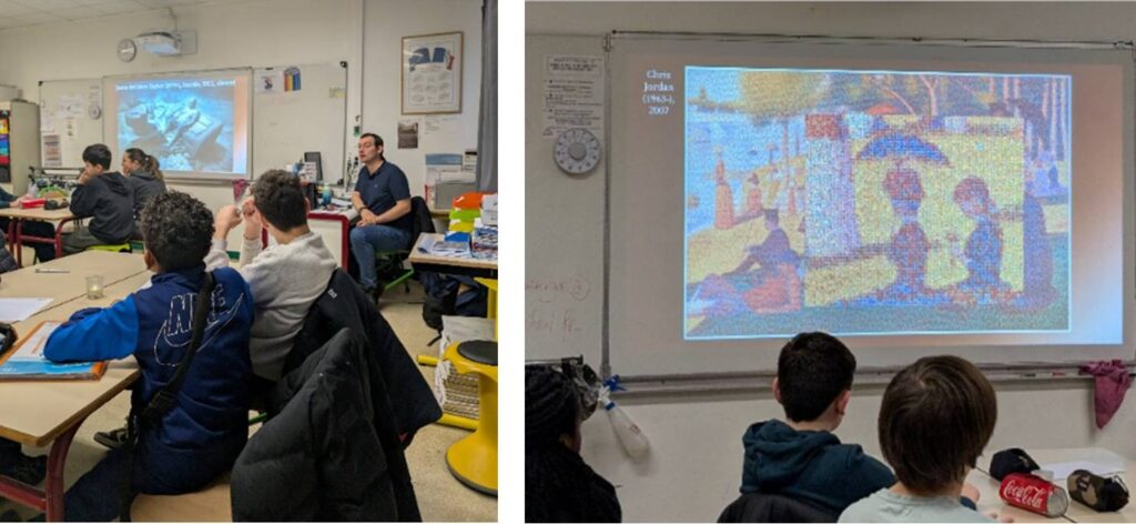 Des sculptures monumentales en plastique ou cannettes aux collages réalisés avec des déchets, les élèves ont découvert que l’art véhiculait un message puissant. Cette rencontre a permis d’illustrer concrètement comment l’art peut sensibiliser le public et devenir un outil de lutte pour la préservation de la planète.